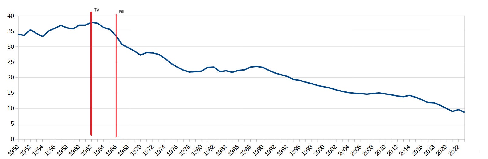 The idea that the advent of television (or radio), along with the accompanying changes in social norms, contributed to decreased fertility is purely speculative on my part. But I felt compelled to propose this theory, if only to underscore how flimsy the case is for attributing the 1960s reduction of fertility to the introduction of the birth control pill.