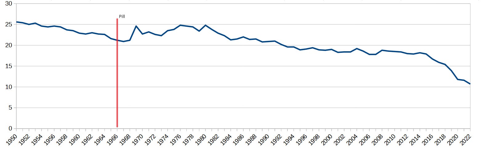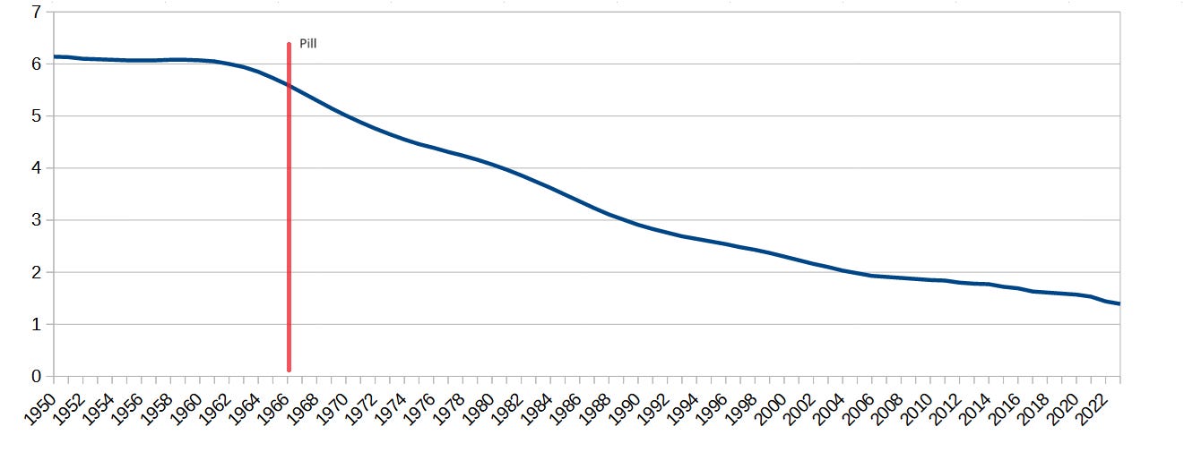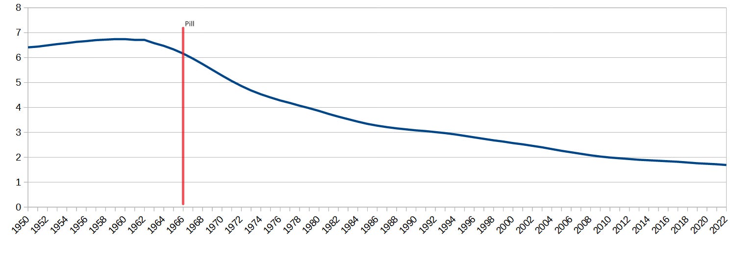 Updating the previous fertility chart to include the introduction of the pill, we can see that decreasing fertility predates the pill: