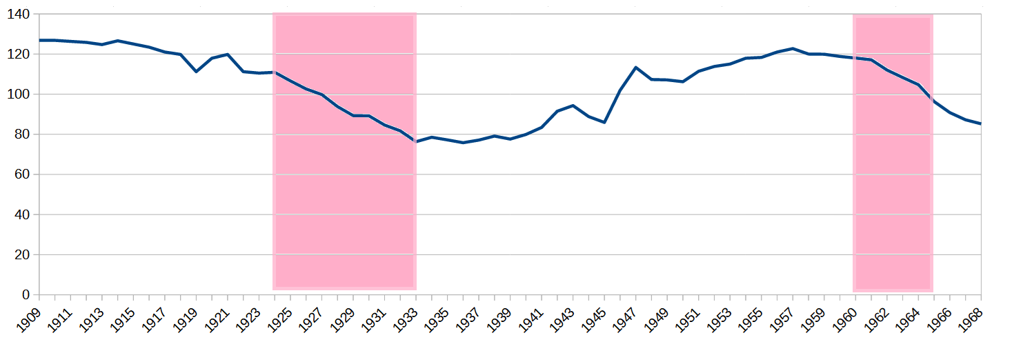 Let's examine the trends in Chilean fertility10 (crude birth rate) over the past 70 years: