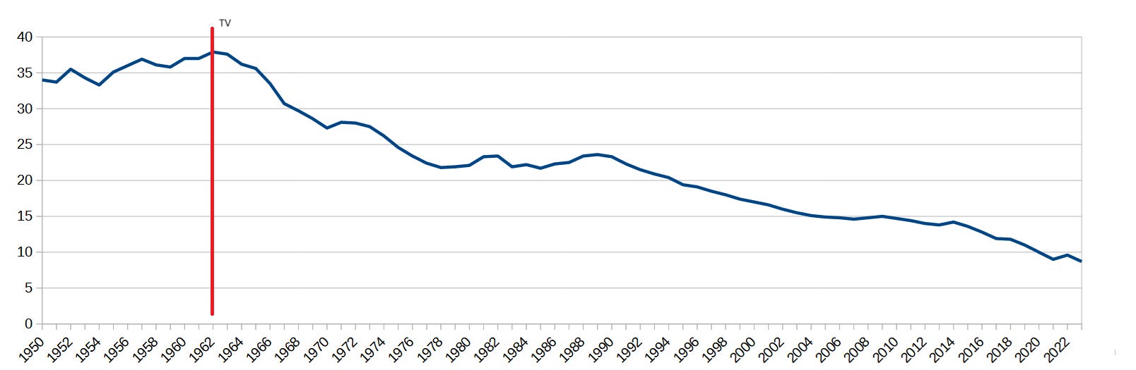 Before presenting a similar chart for the United States, I must acknowledge that based on the graph alone, the case for television having a significant impact on fertility rates is not particularly compelling. So, I decided to cheat and also mark the introduction of the radio in the chart.
