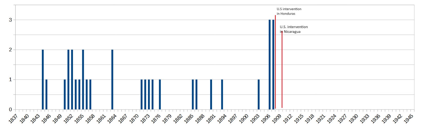 I decided on using single lines representing the beginning of the periods of intervention in Honduras and Nicaragua. Depending on how you define intervention, I could have depicted a series of lines or a broad red bar spanning multiple years. Regardless of the chosen definition, by the final year of that chart, the United States had not stationed troops in Honduras or Nicaragua for more than a decade.