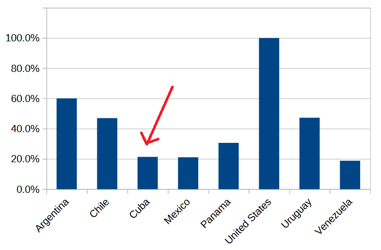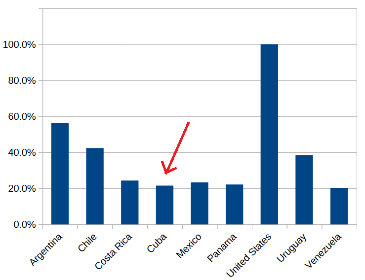 Let’s start with the first sentence. Regarding Cuban per capita income in 1913, it wasn’t even close to 60% of U.S. levels. In fact, it was roughly 21% of American income, very similar to Mexico’s, as you can see in the following chart.