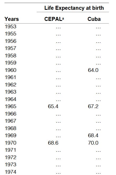 Before drawing any conclusions from these numbers, let’s take a look at the figures from the third source, the Demographic Yearbooks. Life expectancy data was published in most UN Yearbooks since at least 19625, yet no figures for Cuba appear in any Yearbook edition until 1970. The 1967 Demographic Yearbook in particular includes not only the latest life expectancy figures for all available countries, but also historic figures. There was no historic life expectancy data for Cuba at the time.
