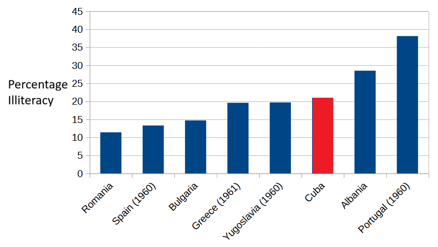 You can see that Cuba’s literacy rate was higher than those of Albania and Portugal11, and comparable to those of Greece and Yugoslavia12. We can safely assume that nearly every other European country not in the above chart had illiteracy rates below 10%13. Cuban literacy did not rival European levels.