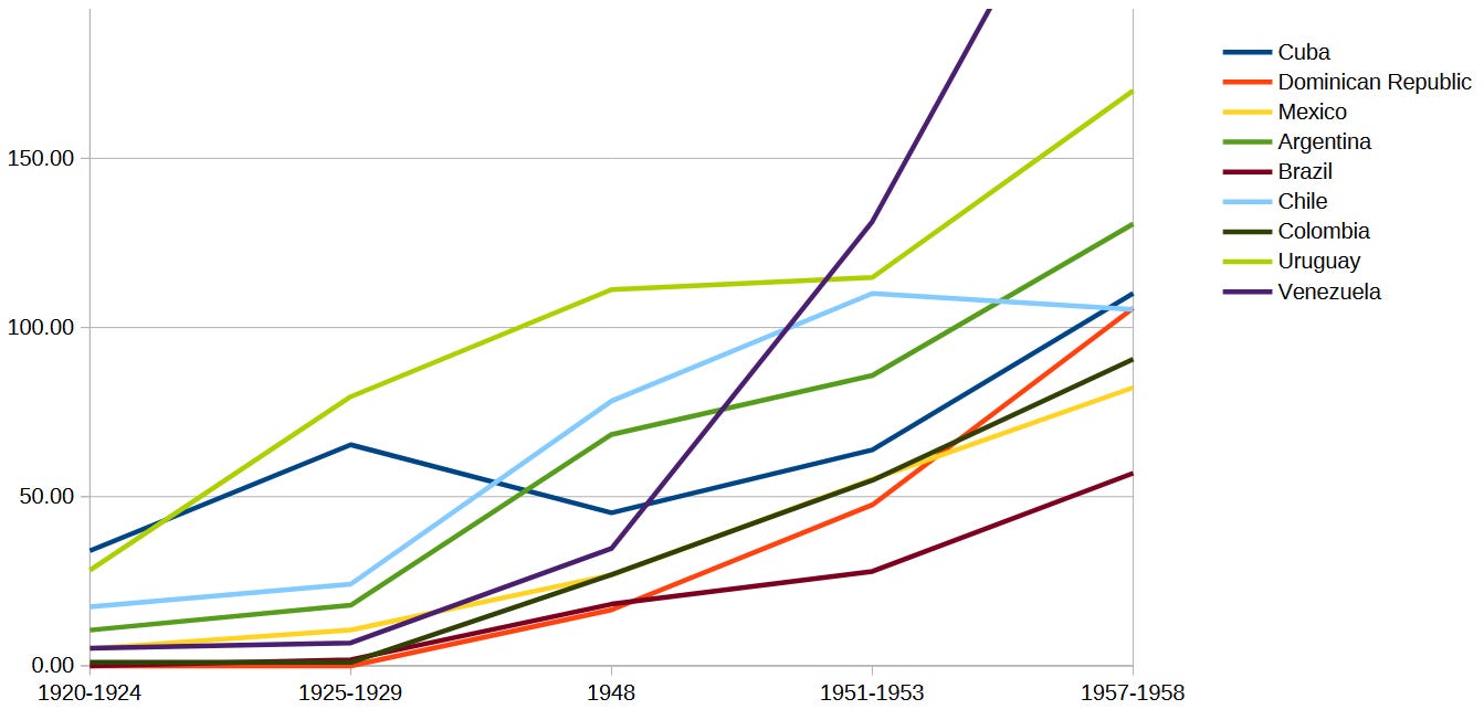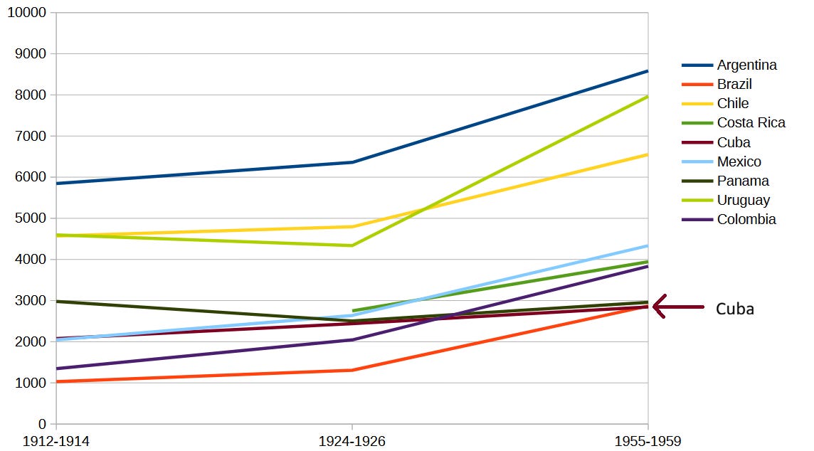As I’ve shown in the previous charts (1913 and 1925), Cuban per capita income in the early 20th century was not higher than Uruguay’s, and very likely not even higher than Chile’s. It was not the second-highest.
