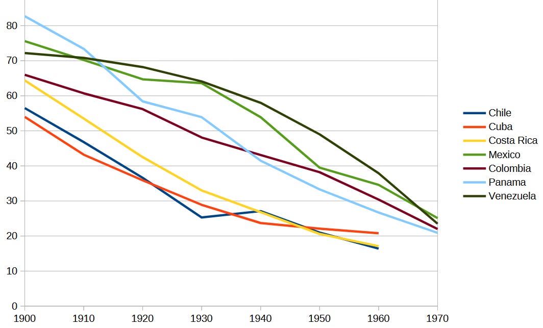 I initially thought of ending the chart in 1960, right after the Revolution, but then added the 1970 illiteracy rates for all countries with higher illiteracy than Cuba. These 1970 data clearly suggests that reducing illiteracy does not become more difficult below a certain threshold (30%?). Colombia, Mexico, Panama and Venezuela continued to reduce illiteracy rapidly while catching up with Cuba.