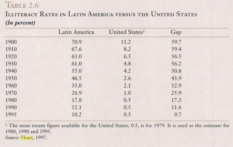 Most Latin American countries were rapidly reducing illiteracy during the mid-20th century, as you can see in the following table from Rosemary Thorp (1998).