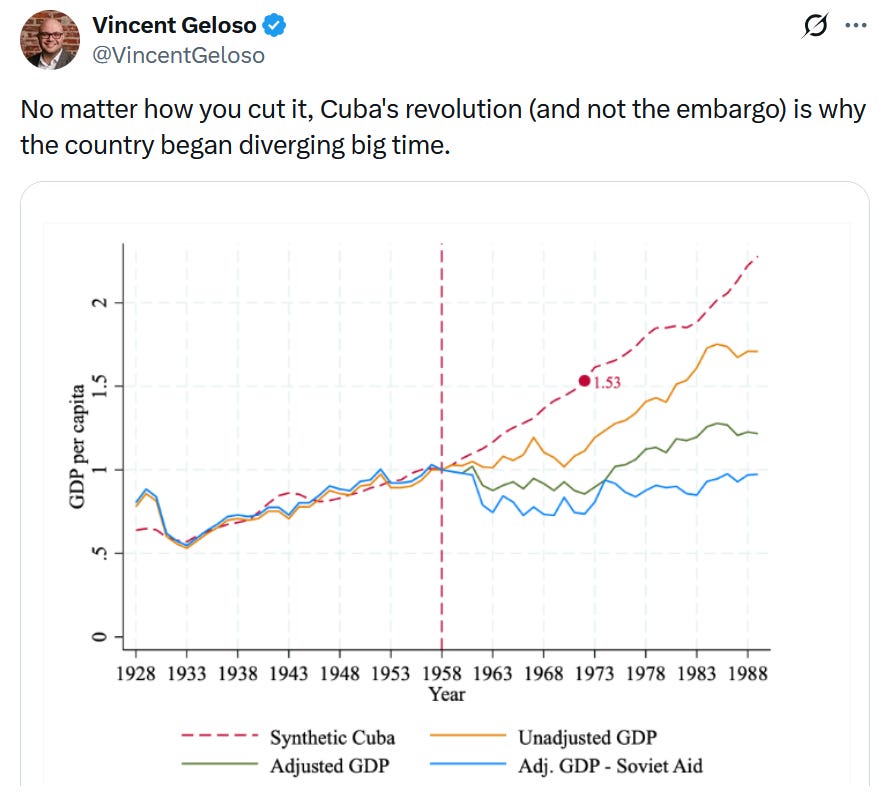 The tweet refers to a 2025 paper by Geloso and Jamie Bologna Pavlik which uses a clever econometric method, synthetic controls, to estimate what the trajectory of Cuban per capita GDP could have been absent the 1959 Revolution, and concludes that the main cause of Cuba’s current poverty is not the American embargo but revolutionary policies.