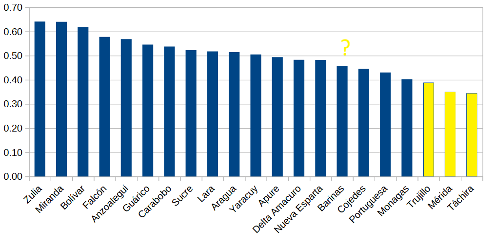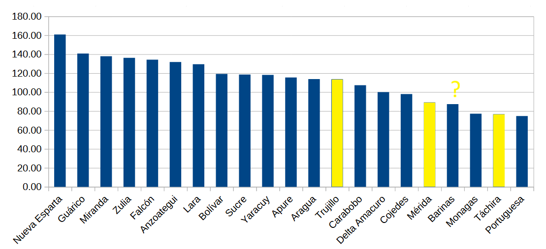 The three Andean region states (Mérida, Táchira and Trujillo) show low rates of “crazies”, but not exceptionally low. And, of course, it’s also possible that census takers did not evaluate mental health in a uniform manner across Venezuelan states.