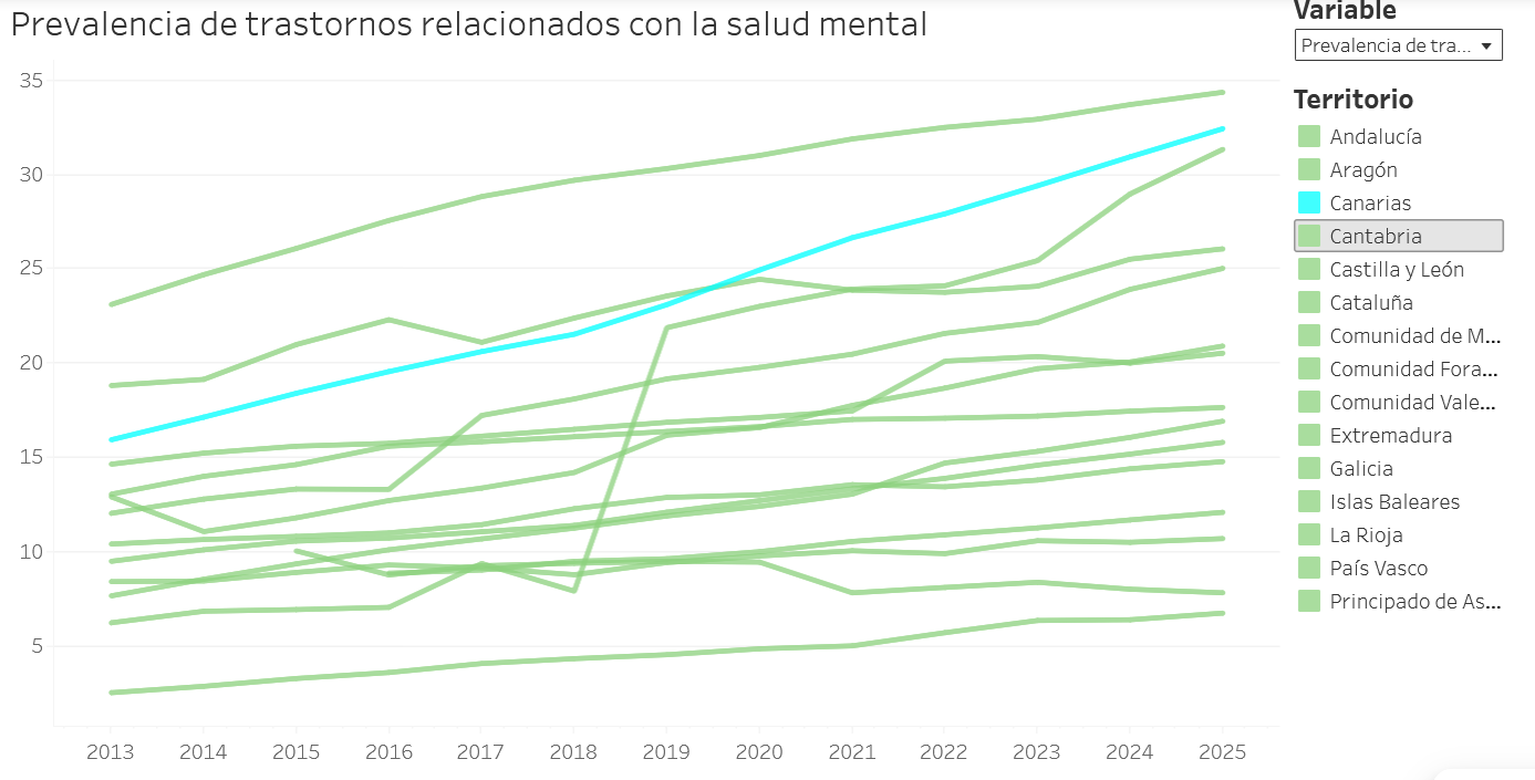 This high rate of mental disorders is not a recent phenomenon. As you can see in the following chart, this has been the case for more than a decade - though notice that the Valencian Community shows a higher rate in the chart4.