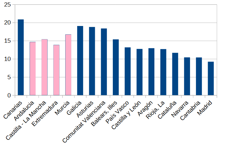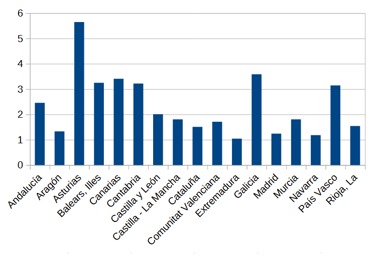 By region, the highest figures were in the Canary Islands (518.5); Valencian Community (466.8) and Murcia (424.3), while Castilla-La Mancha (103.4); Extremadura (132.9); Andalusia (135.4) and the Basque Country (299.4) did not reach the national average.