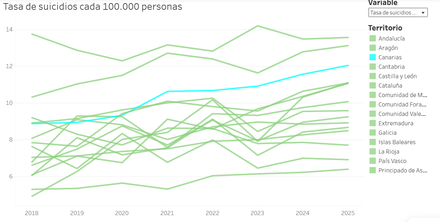 And this pattern aligns with other mental health indicators, such as the suicide rate per 100,000 people. While the Canary Islands do not display the highest raw suicide rate in the next chart, this is likely a result of not adjusting by age structure, as Asturias (highest) and Galicia (second-highest) have the oldest populations in Spain.