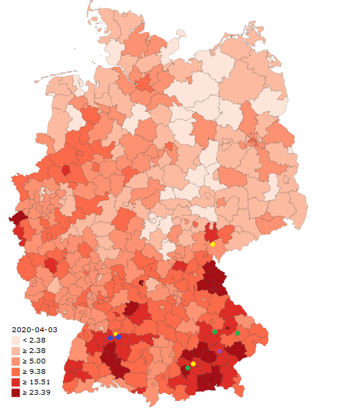 The next map shows cases by district for Germany by April 3. I’ve put a blue dot marking the headquarters of Mercedes-Benz in Germany in the city of Stuttgart, right on the limit with Esslingen district, and another one on Sindelfingen (Böblingen district). Stuttgart is one of the most affected cities in Germany, Esslingen is considered one of the hotspots in Germany, and several other districts surrounding Stuttgart also make the list.