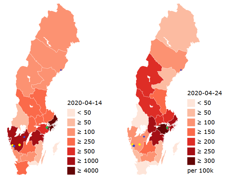Let’s see those locations over a map of cases for different regions of Sweden. I’ve used green dots for Scania locations, blue dots for Volvo Trucks locations, and yellow dots for Volvo Buses locations.