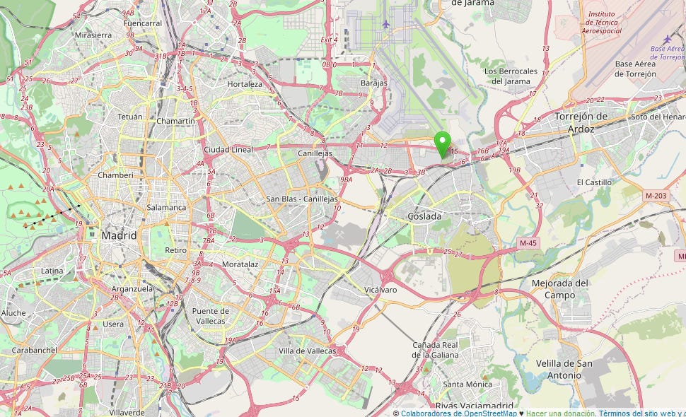 The green pin is the location of the Madrid Iveco plant, just below Madrid Barajas Airport. To the left of the map is the center of Madrid, and you can even see on the lower part of the map a bit of the Vallecas area.