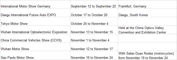 This is a list of several trade fairs for the automotive industry held during the last months of 2019.