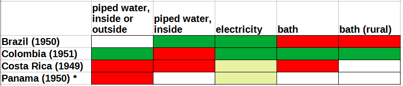 I excluded Argentina, Chile, Uruguay and Venezuela because we already know they had a higher income than Cuba. I excluded Mexico for lack of urban dwellings data. Didn’t consider one other dwelling attribute (gas) because there was no data for Cuba. Didn’t consider rural dwellings, with one exception, because there was no data for the other four countries.