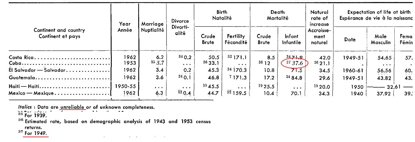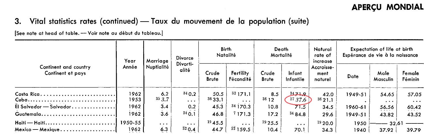 I finally was able to find an infant mortality rate for Cuba in the 1962 Demographic Yearbook’s table on “Vital statistics rates“ (page 141). The figure was 37.6 deaths per 1,000 live births: