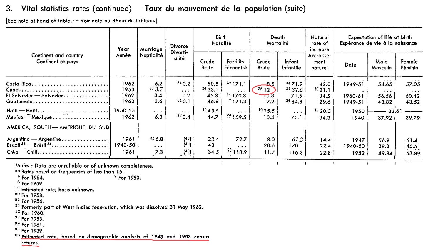 The rate is 12 deaths per 1,000 population. It's important to note that this rate cannot be directly compared to those of other Latin American countries, as seen in the screenshot. This is because most of those countries had healthcare systems that were able to report basic data in a timely manner. You would be comparing Cuba's 1953 rate to other countries' 1961 or 1962 death rates.