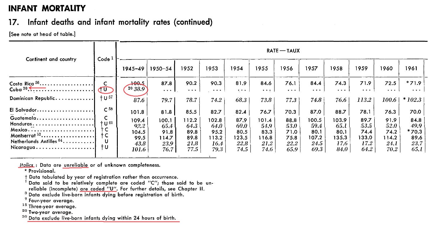 Next, I tried the 1959 Demographic Yearbook’s table on "Infant deaths and infant mortality rates" (table 28), and again couldn’t find the rates for Cuba12. In fact, Cuba is the only Latin American country for which data was missing in that year’s table.