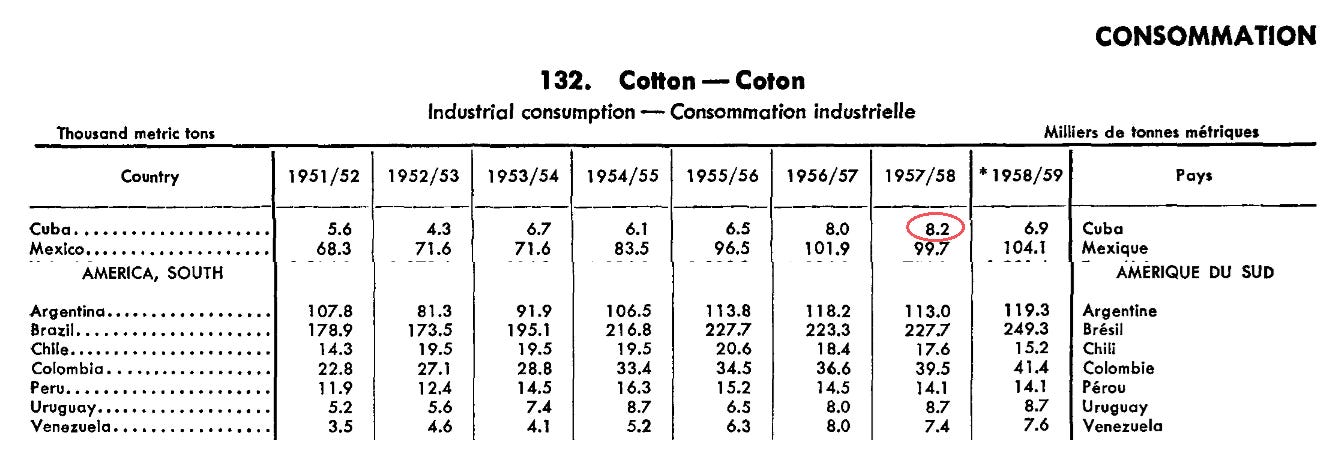 Industrial consumption of cotton, a crucial indicator of the development level of the textile industry, was much lower in Cuba7 than in Mexico, Colombia and Peru:
