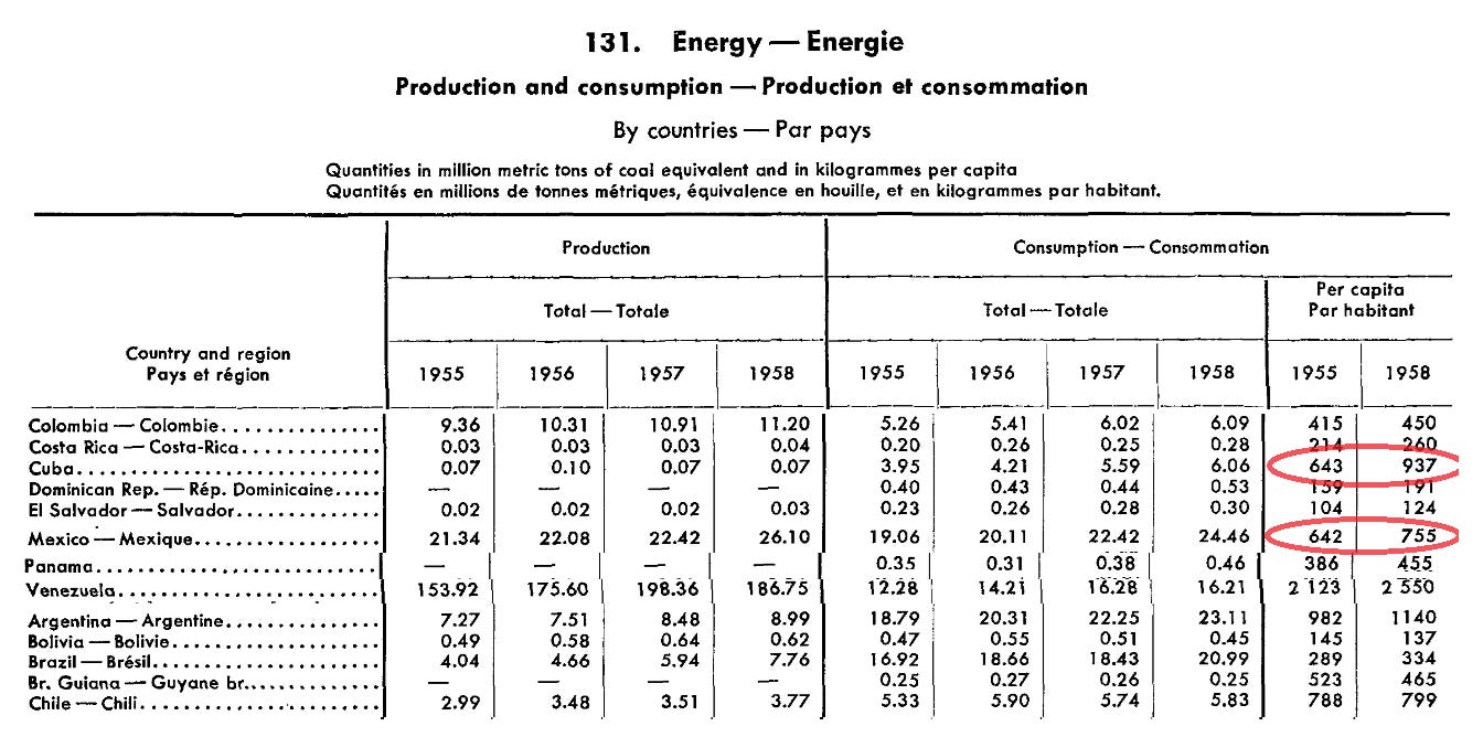 Per capita energy consumption, which had been on par with Mexico in the mid-1950s, briefly exceeded that of Mexico in 19576. This was only temporary, as Mexico again surpassed Cuba in 1961:
