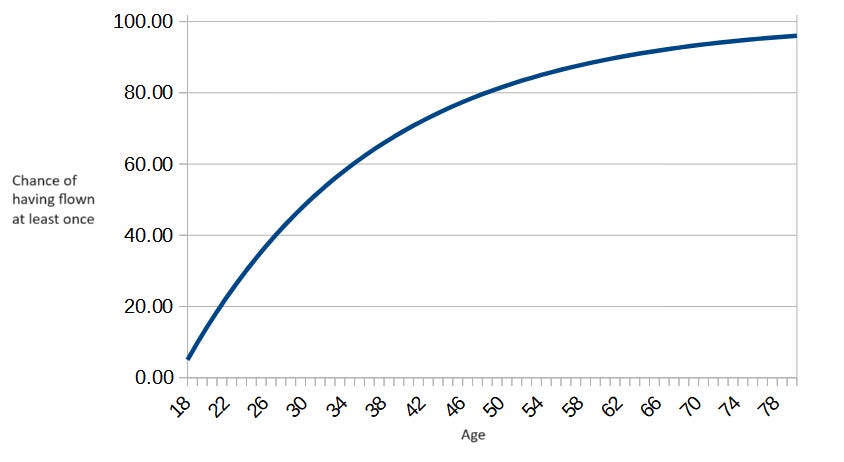 The purpose of this graph is to point out as clearly as possible that younger people, say 18 to 35 years old, have flown less than older people, and this is to be expected. In fact for the previously stated assumptions only 36.37% of people in the range of 18 to 35 y.o. would have flown at least once in their lives. That is compared to 71% of all people having flown at least once in their life, which is equivalent to 29% of people not having ever flown (I chose the 5% chance not because it is a nice round number, but because it gives the exact 71% chance that I was looking for).