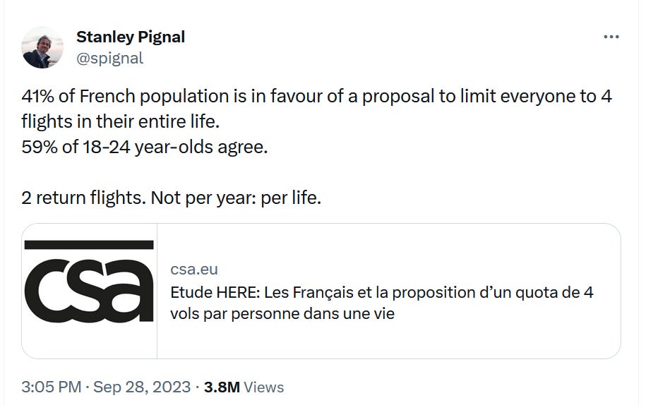You might remember having heard of a French poll about air travel during the last days of September or the first days of October. The results of that poll seemed to imply that 41% of the French population is in favor of limiting everyone to having four air flights in their entire life.