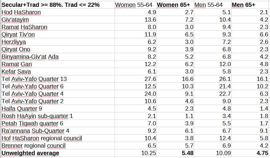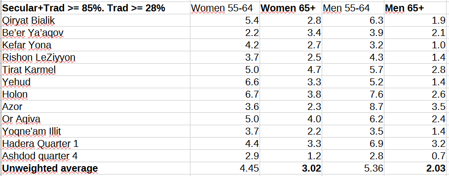 I won’t show you the table with never-married percentages of 65+ women in overwhelmingly Haredi localities because it adds little of value. But I will show you the corresponding Dati table.