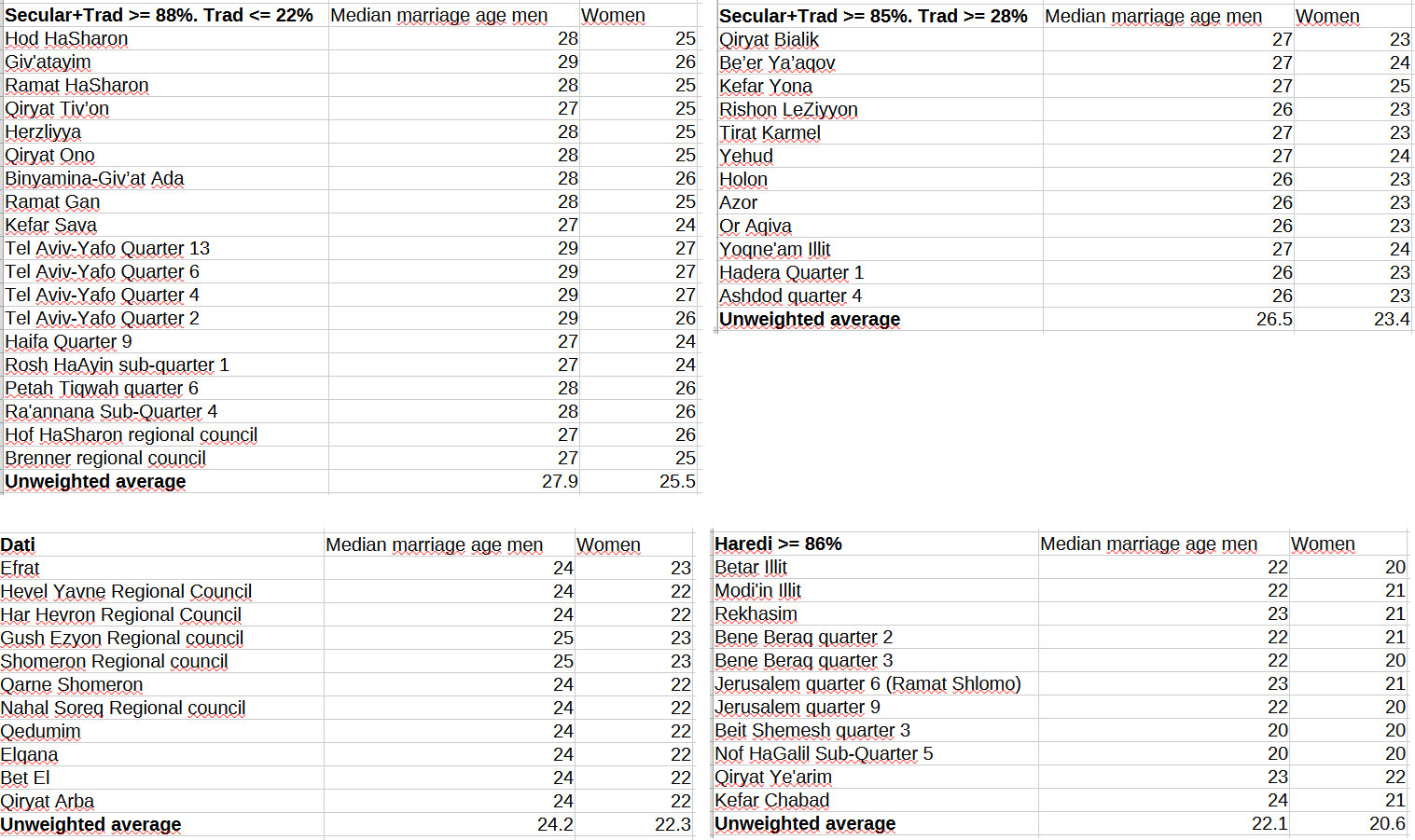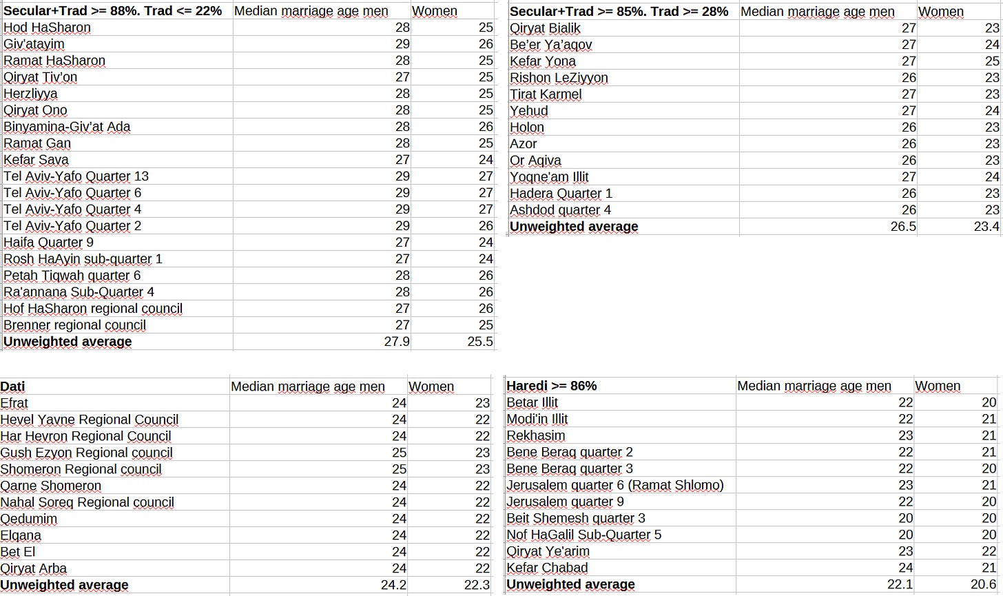 To estimate the median age at first marriage for each Jewish Israeli religiosity group, I used the same methodology as before, calculating the average age over a sample of localities where the overwhelming majority of households belong to that group. I’ll skip the tables (you can find them in the footnotes8) and go straight to the results.