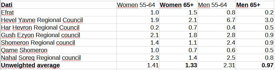 That being said, the above table suggests large variation across localities in the number of never-married 65+ Datis, while implying that unmarried men and women in the oldest cohorts are rare (1.33% for 65+ women), though not as rare as among Haredis. It appears that marriage is almost as important for Datis as it is for Haredis.