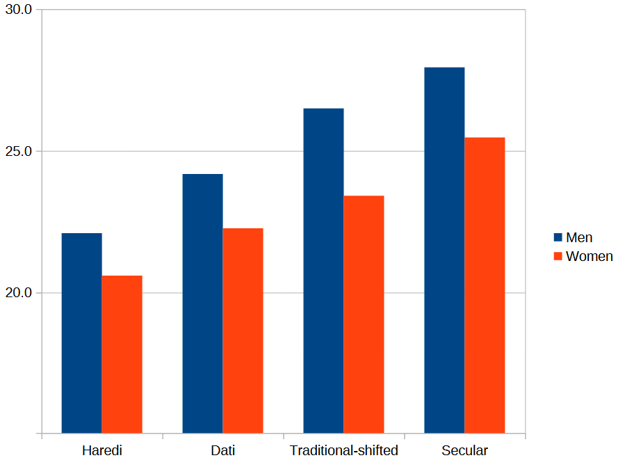 The national Israeli mean is slightly below average, but well within the developed country range. And we’ve already seen that Secular Israelis marry substantially later than Haredi and Dati (and very likely Traditionals), so we can safely estimate their mean age at first marriage as higher than 30.6 years for men and 28.2 for women.