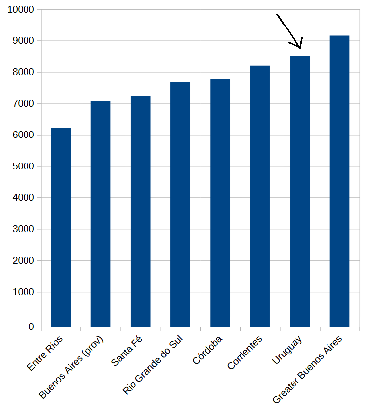 The bar chart I’m now going to show you displays the CPP values for seven Argentine provinces and Brazilian states bordering or near8 Uruguay. These subnational entities are mostly comparable to Uruguay in size and population, and just like Uruguay, they received a substantial number of European migrants during the late 19th and early 20th century. You could say they are nearly as European as Uruguay, but without a significant Canarian influence.