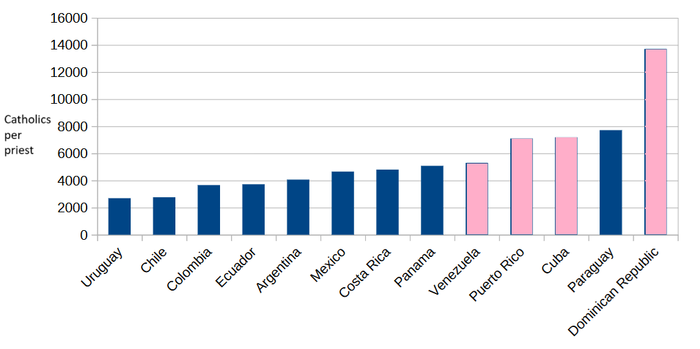 The chart I was referring to, showing the number of Catholics per priest in the year 1950 across 13 Latin American countries is this one: