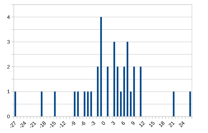 Even though it’s a small number of shows (just 34) you can see that the distribution of AS differences is a normal distribution, with a Skewness value of -0.42, standard deviation (σ) of 10.09, and its platykurtic.