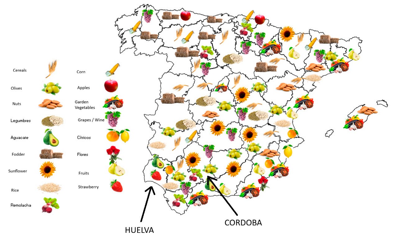 Córdoba province, being far from the coast, does not enjoy the mild weather that is ideal for growing garden vegetables and many fruits, but instead it produces a lot of wheat, over three times as much as Huelva8. Wheat farming is highly mechanized though, requiring little labor compared to other crops. If we want to find an agricultural product grown in Córdoba that requires a large workforce, we should look at other crops. The following map, showing the main crops in every region and province of Spain, should give us a good idea of what other major crops are grown in Córdoba.