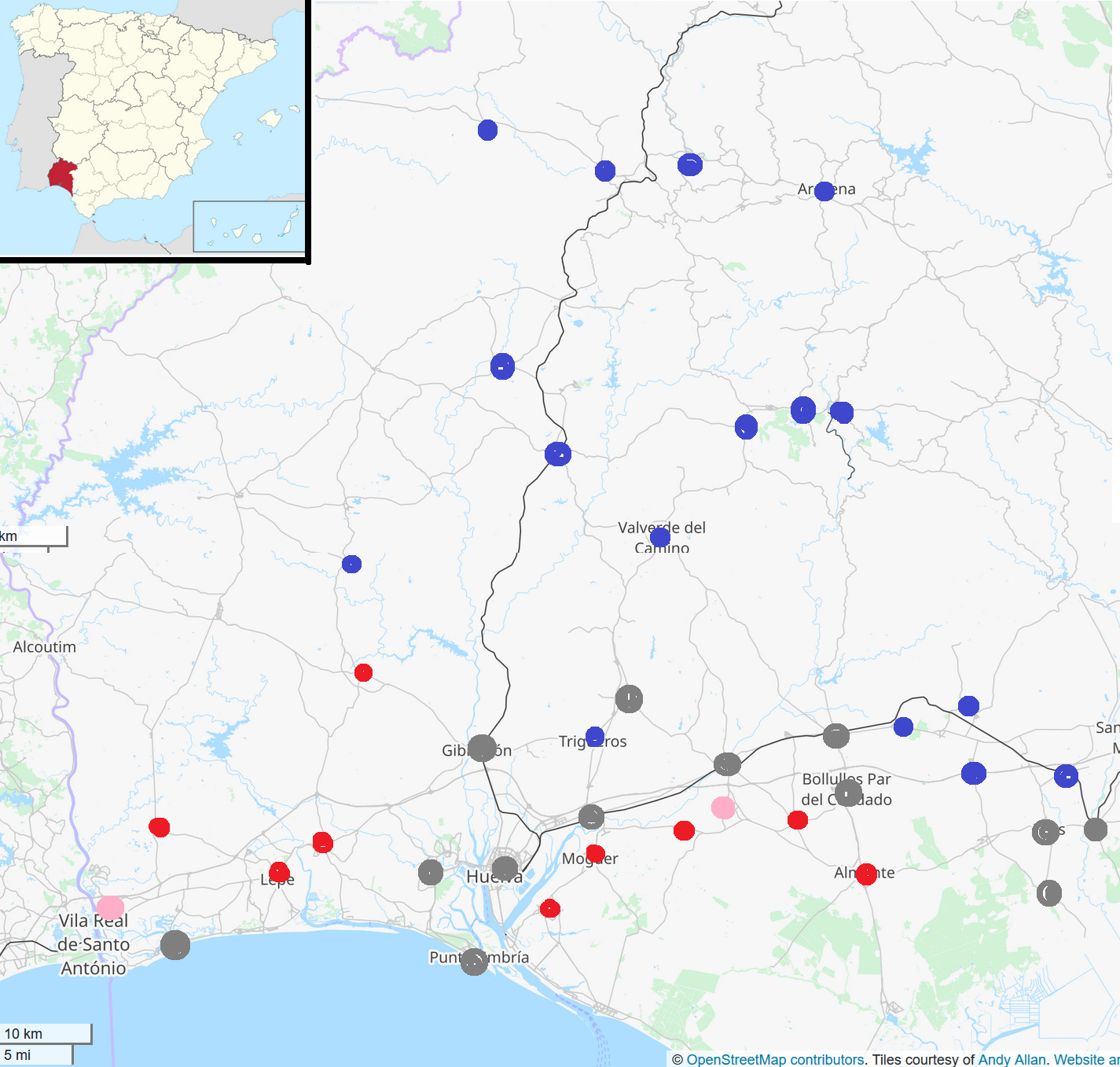 Huelva’s ideal conditions for greenhouse farming create a strong demand for unskilled labor, so migrants naturally move to where the jobs are, which is where the berries are. Mind you, not all of Huelva province shares the same climate. The further inland you go, away from the sea’s moderating influence, the less economically viable greenhouse farming becomes. This geographical pattern of Huelva’s agriculture is mirrored by a geographical pattern of immigrant settlement, as you can see in the map below.