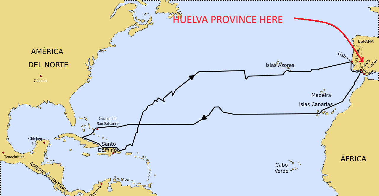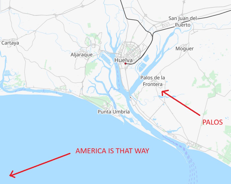 Well, that dot labeled “Palos“ corresponds to the town of Palos de la Frontera, in Huelva province. And if we zoom in on the coastal area where Palos is located, it looks like this (modern map, so ignore the roads and highways):