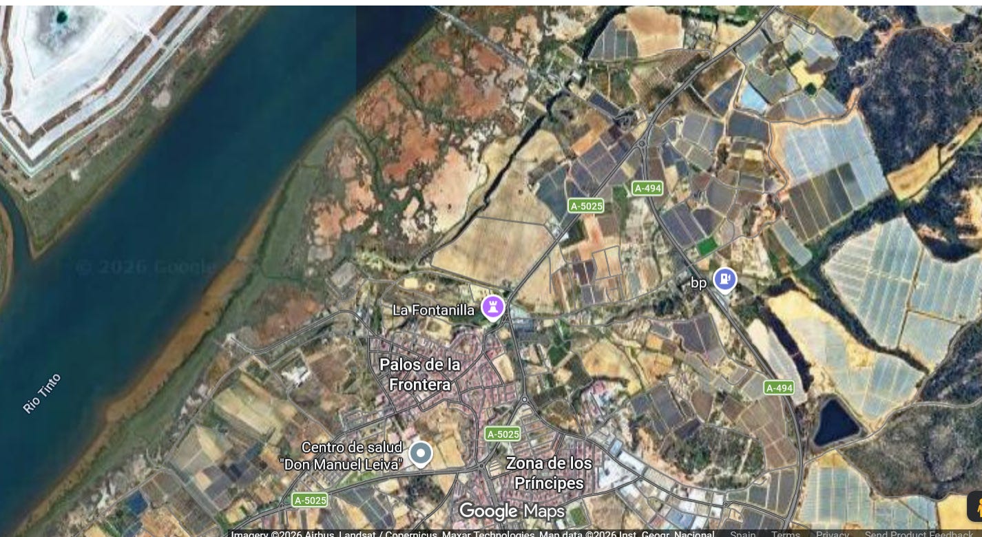 If we zoom in even further on a satellite image of the Palos area (credit Google Maps), you can see the location of the old 15th-century port, to the left of the label “La Fontanilla“. You can also see the many, many silvery, unnatural-looking structures surrounding the town of Palos (locals don’t call it “de la Frontera”).