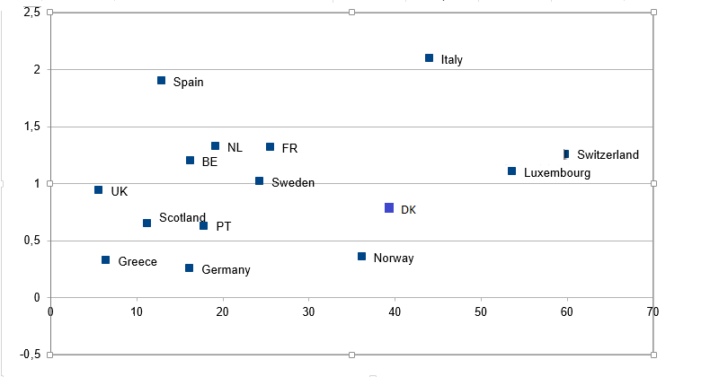 Not a very clear correlation. If there is supposed to be some correlation between the number of visitors from China (leisure or work related) and the number of cases for each country, some countries would appear to be outliers. Spain, Belgium, the Netherlands, the UK, maybe Norway. And Italy doesn’t look like such a public health disaster, but still worse than it “should”.