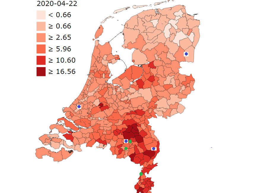 I’m putting Italy and the Netherlands together in order to make the article more concise. Wuhan is a major hub for some industries and one of those industries is Optics. The Chinese Optics Valley is home to several important companies in this industry and one of the biggest in Wuhan is Yangtze Optical Fibre and Cable Company Ltd. (YOFC), a joint venture between Italian company Prysmian (through its subsidiary Draka Comteq B.V.) and Wuhan Yangtze Communications Industry Group. Prysmian is headquartered in Milan, with factories in Lombardy (Merlino) and other regions of Italy. Draka Comteq is its Dutch subsidiary acquired in 2010, and it has operations in several locations in the Netherlands: Emmen, Nieuw-Bergen, Eindhoven, Delft. The blue dots mark those locations over a map of current reported cases in the Netherlands per 10,000 people.
