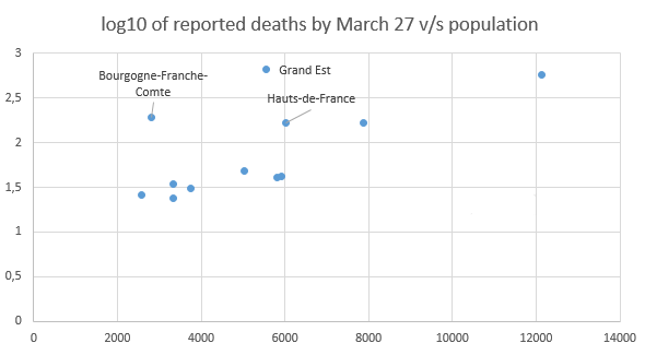 You can see that there are some exceptions to this supposed correlation, the regions of: Grand Est, Hauts-de-France and Bourgogne-Franche-Comté. If we plot log deaths against the population of each region those exceptions seem to hold.