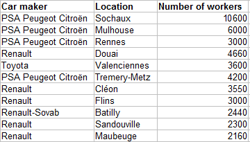 The relationship is not just geographical but also seems to have a “size” component. Sochaux appears to be the biggest factory in France(10,500 workers).