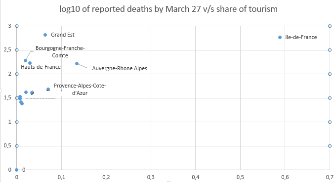 We’ve already seen that France seems to have a predictable number of deaths given its number of visitors, but what about the different regions that compose France.