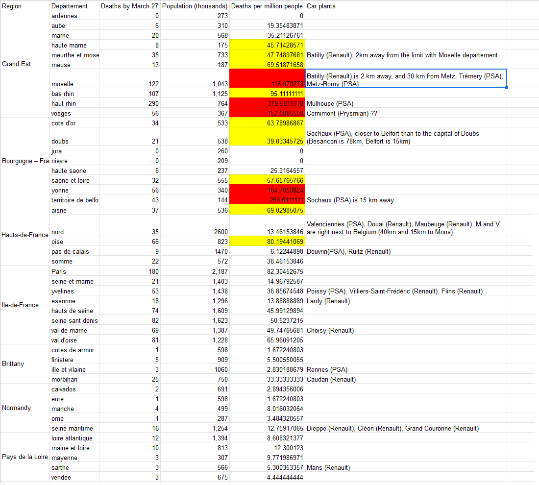 So in order to know what is going on with those regions I’ve made a table (sorry, no map) with deaths per million people by March 27 for all French departements of those regions and some other regions for comparison: