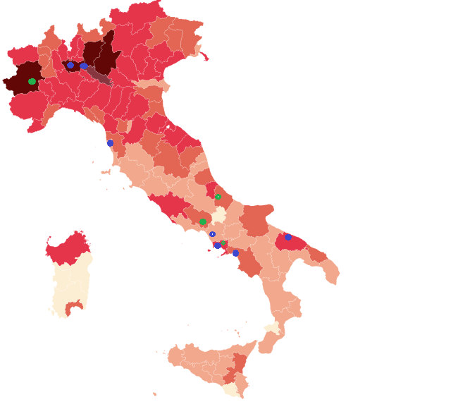 If you think the dots might correlate well with cases in southern Italy but not much with cases in northern Italy, you are right. But going back to those leisure visitors, 4 regions in northern Italy concentrate 72% of all reported deaths in Italy: Veneto, Lombardy, Emilia-Romagna, Trentino-Alto Adige/Südtirol. Those 4 regions also concentrate 42% of all overnight stays by tourists.