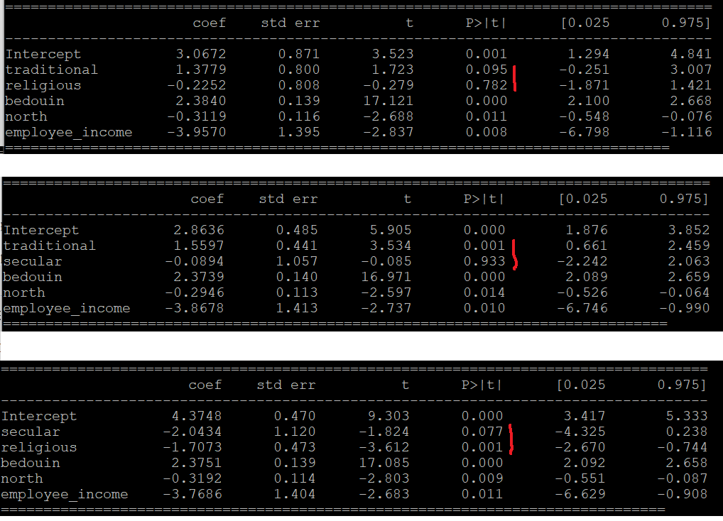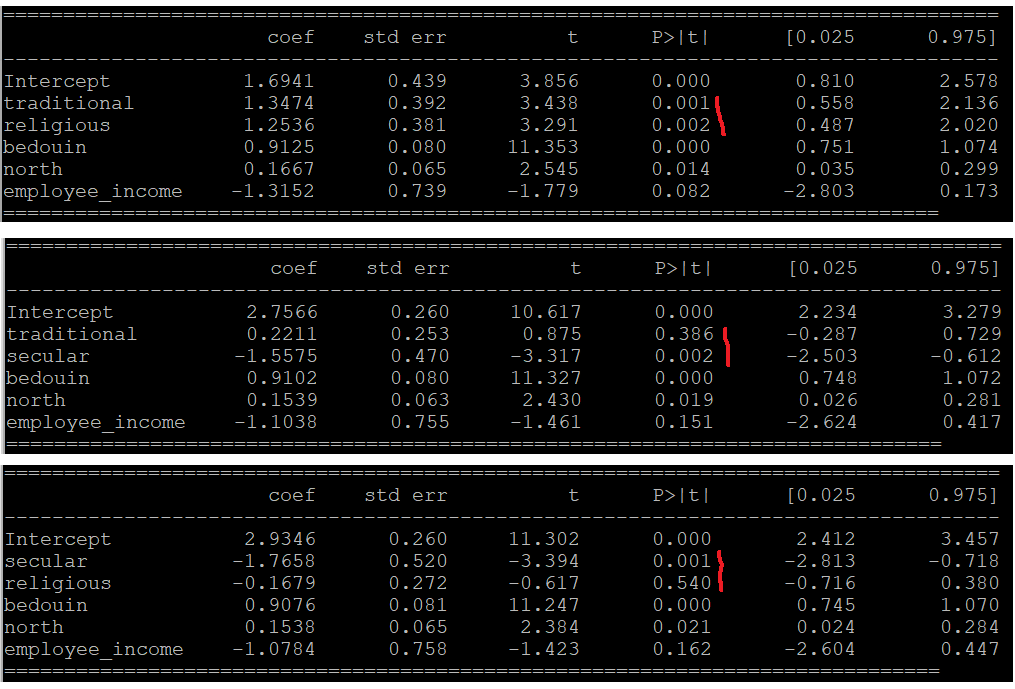 Just to make sure, I also ran a model with all three religiosity variables and none of them reaches statistical significance, while the three other variables (north region, bedouin region and median income) remain statistically significant.
