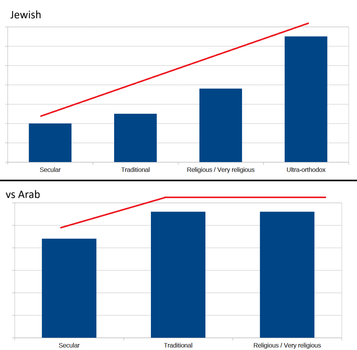 In short, religiosity does appear to affect Arab Israeli fertility but only in a binary way: religious households have more children than non-religious (Secular) ones. Yet the level of religiosity, Traditional or Religious / Very religious, of practicing Arab Israelis doesn’t have any impact on fertility. In contrast to Jewish Israelis, who exhibit a clear increase in fertility for each increase in religiosity, Arab Israelis show no additional fertility increase beyond the religious-vs-Secular divide.