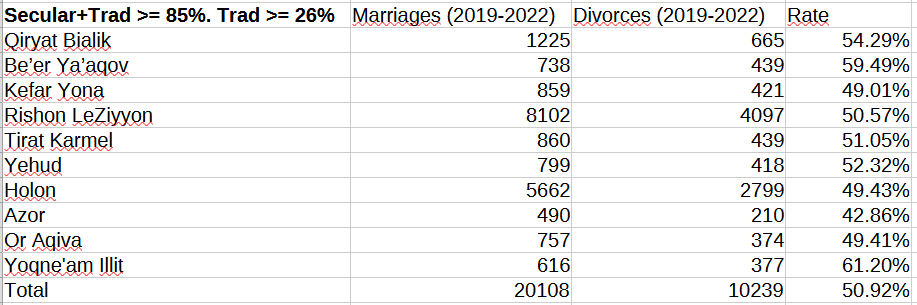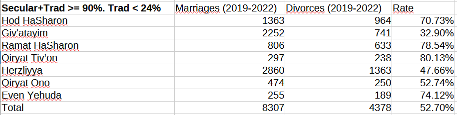 Actually, the CBS also publishes marriage and divorce numbers for local councils - an administrative unit for smaller towns - and regional councils (grouping several minor localities), allowing us to broaden our search for overwhelmingly Secular localities, overwhelmingly Dati localities, etc. This will enable us to examine a larger sample and calculate a rate for each locality in the sample, beginning with overwhelmingly Haredi localities.