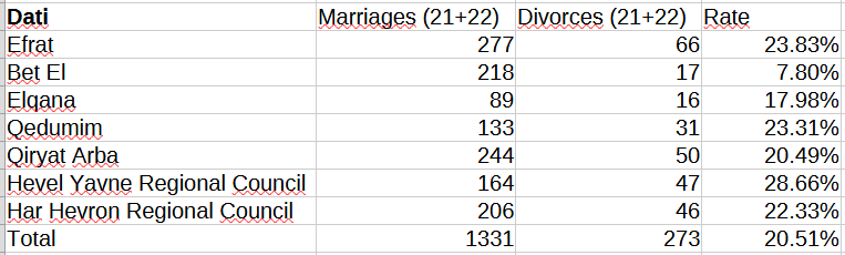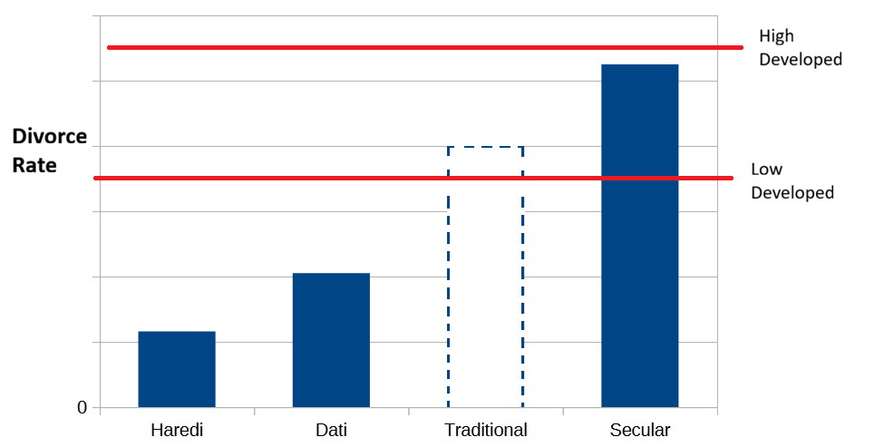 So, the Haredi divorce rate is somewhere around 11.6%3. That’s higher than Vietnam, yet far below the divorce rate of any developed country. So far, so good. Let’s move on to the Dati.